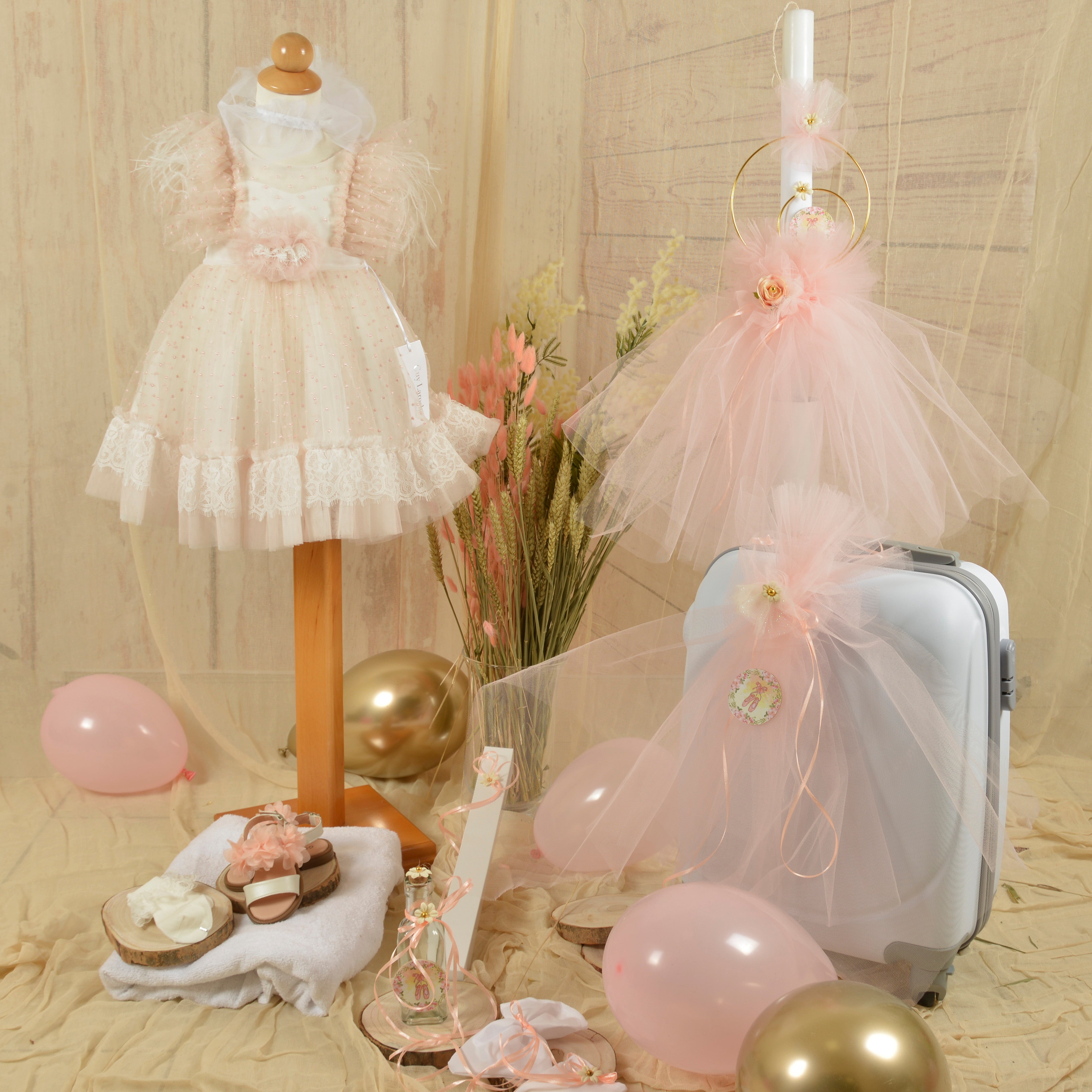 A complete christening package for the most impressive appearance of your little ballerina, in shades of rotten apple.