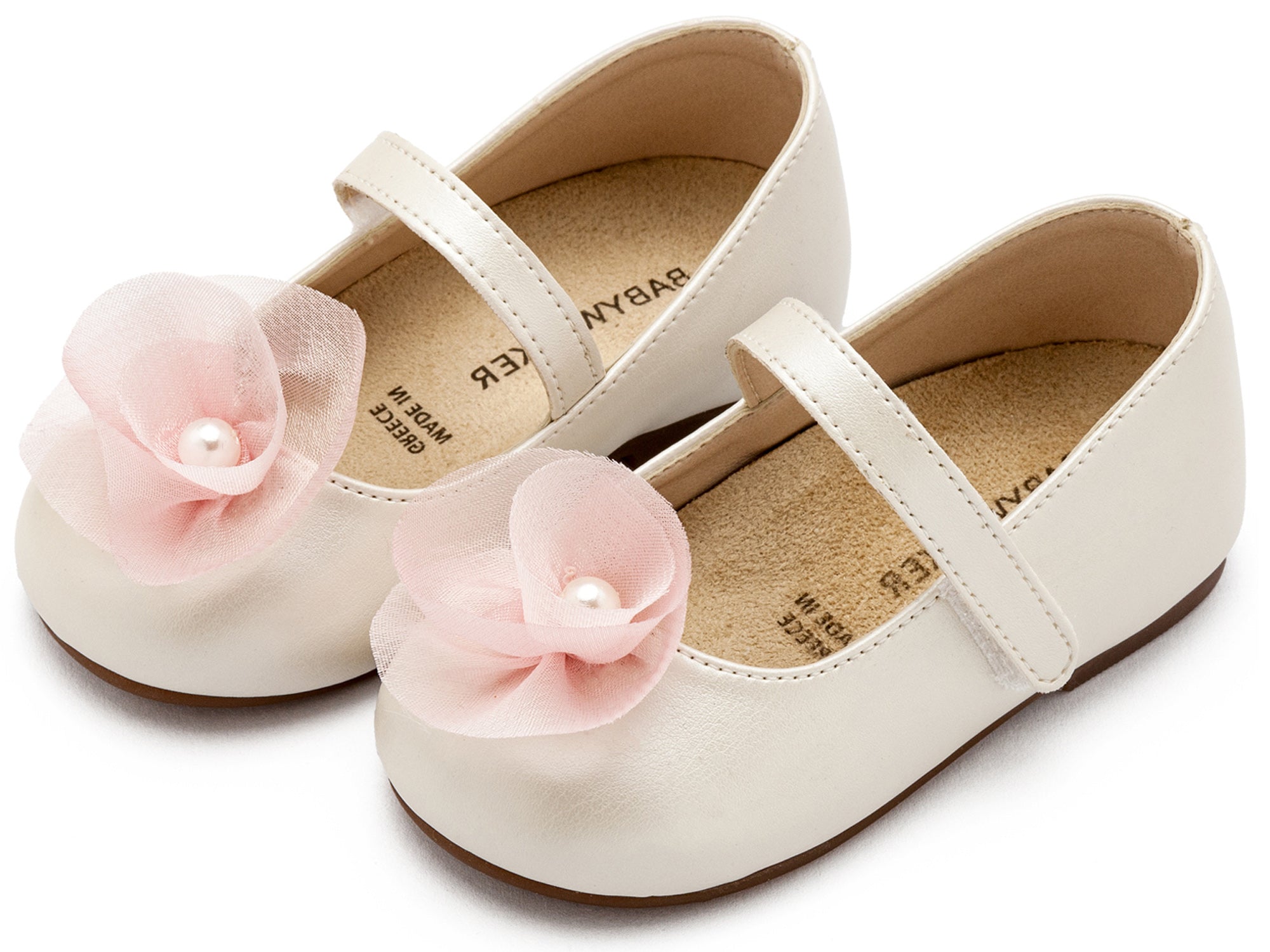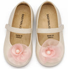 Γοβάκι Μονή Μπαρέτα με Χειροποίητο Λουλούδι απο Οργάντζα και Πέρλα σε Εκρού Ροζ Χρώμα