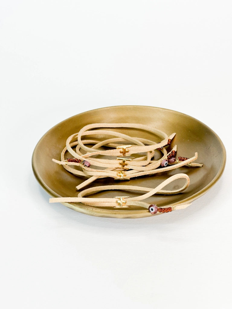 Martyrdom bracelet with beige suede cord, rotten apple eye, cross and brown miyuki. The photos have been edited, the colors may differ slightly in reality.