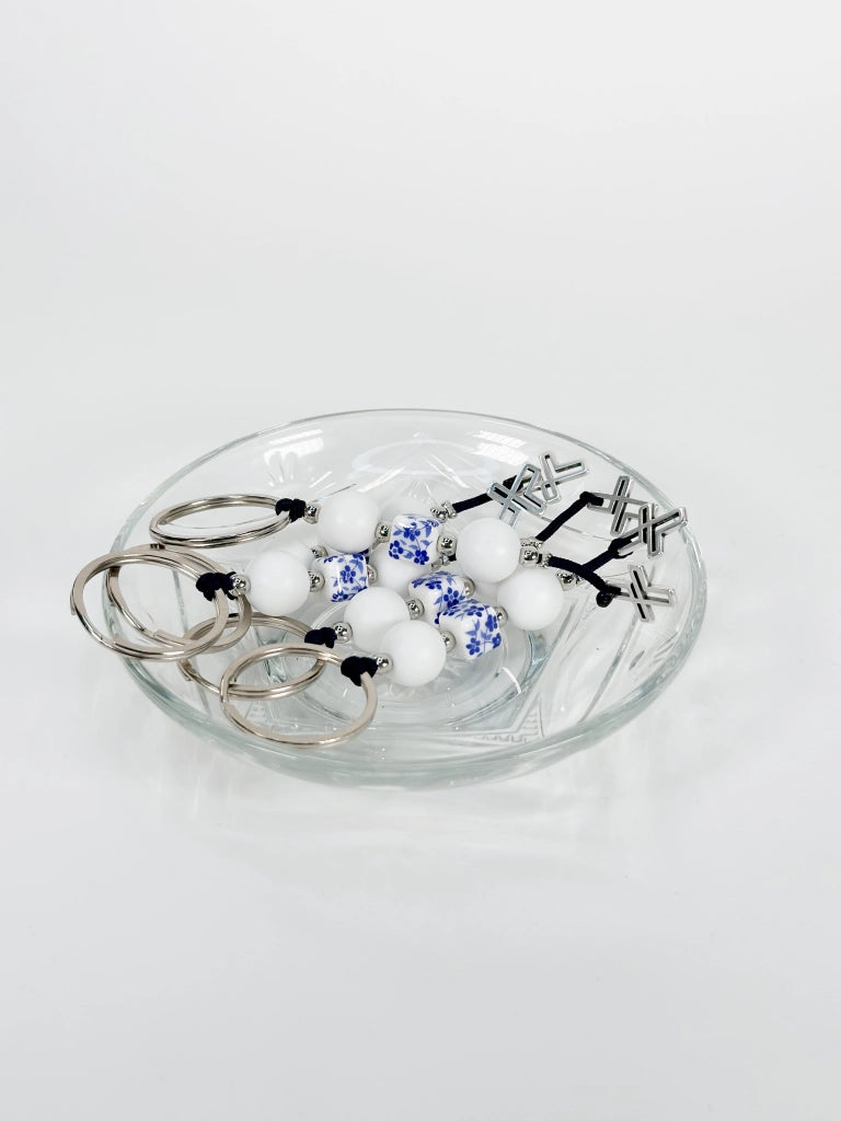 Handmade Martyrdom Keychain with white beads, blue flowers and silver details