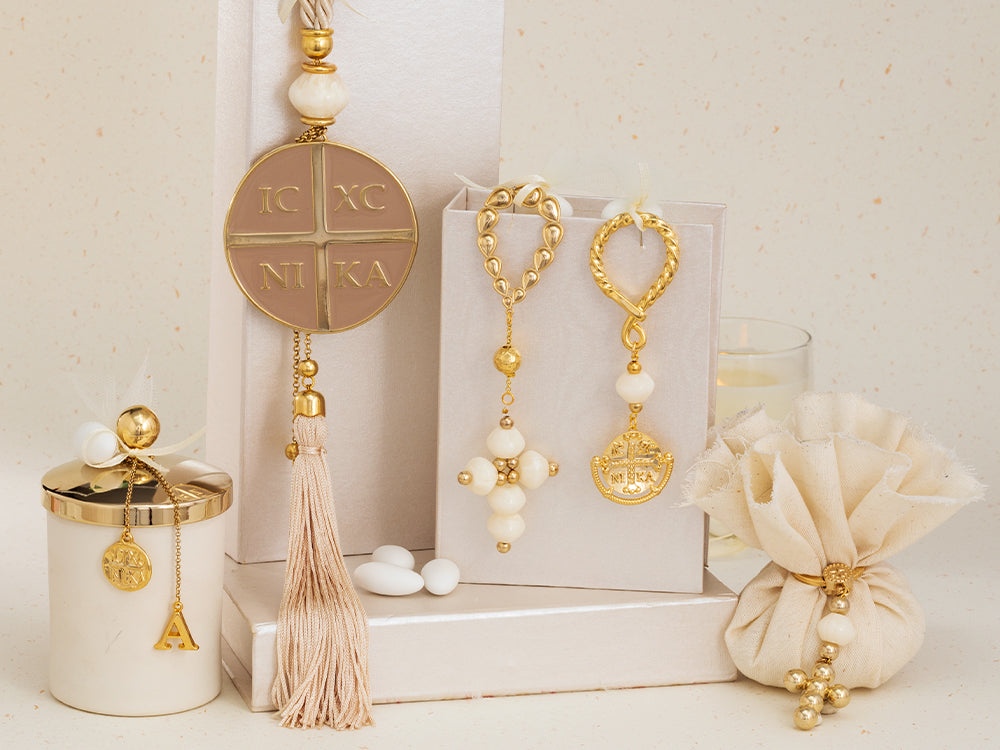 Μπομπονιέρακερί εκρού με Κωνσταντινάτο και μονόγραμμα.