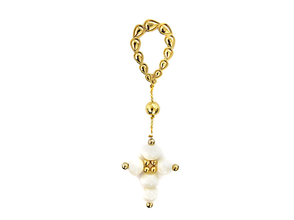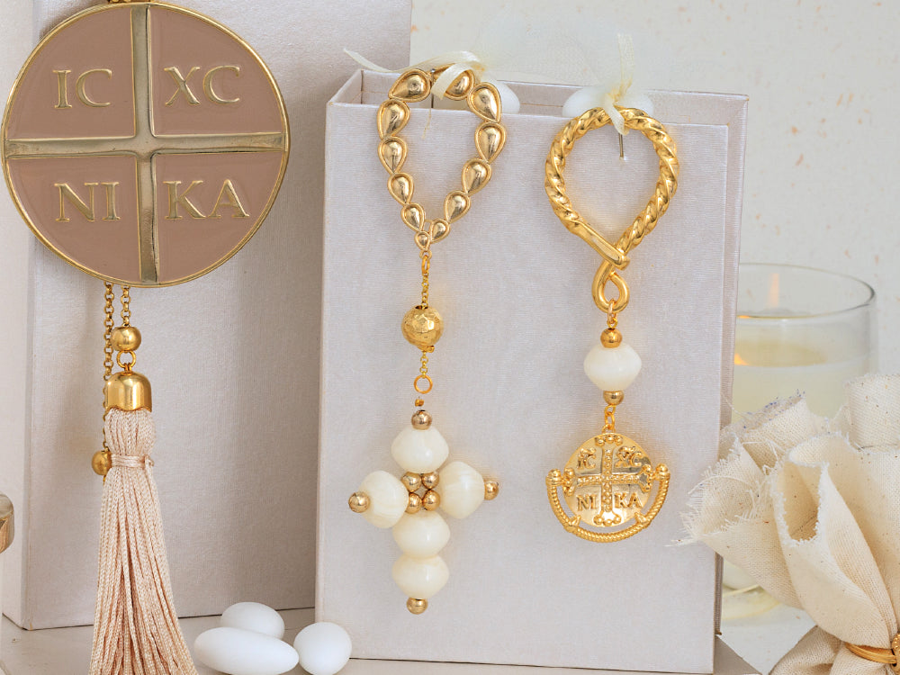 Μπομπονιέρα σταυρός με εκρού χάντρες.