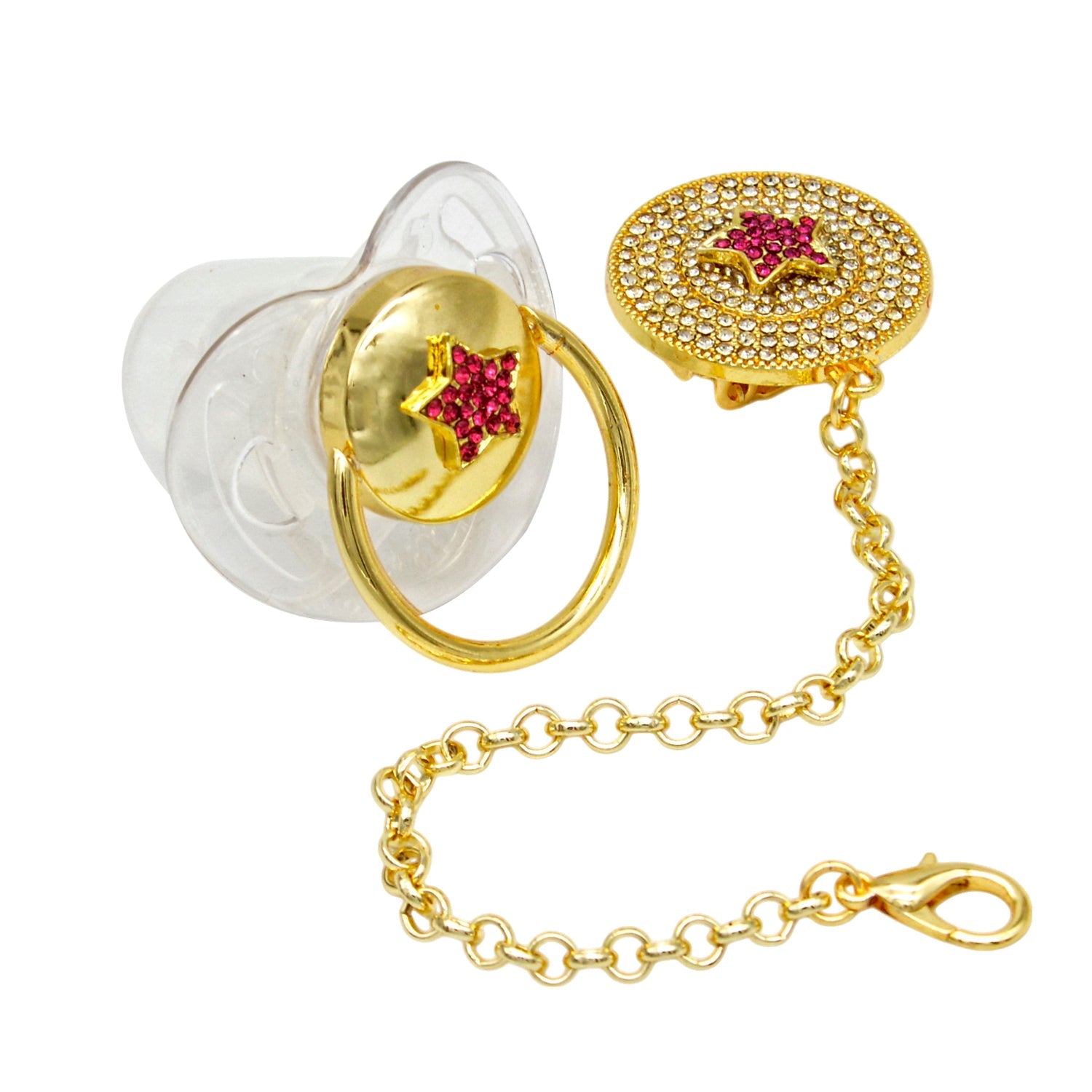 Handmade luxury pacifier with transparent base, star design and matching clip chain. Unique pacifiers with rhinestones for the most special appearances of your baby!