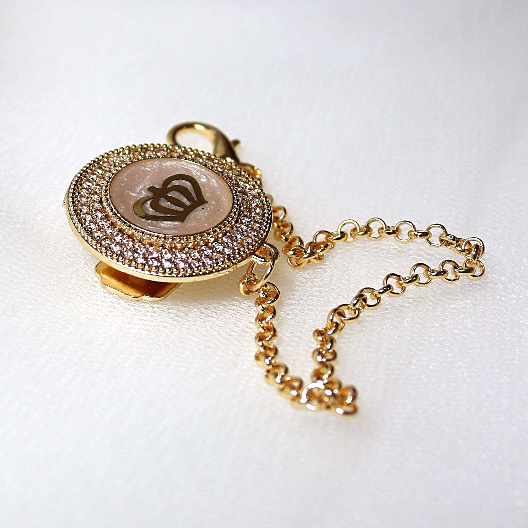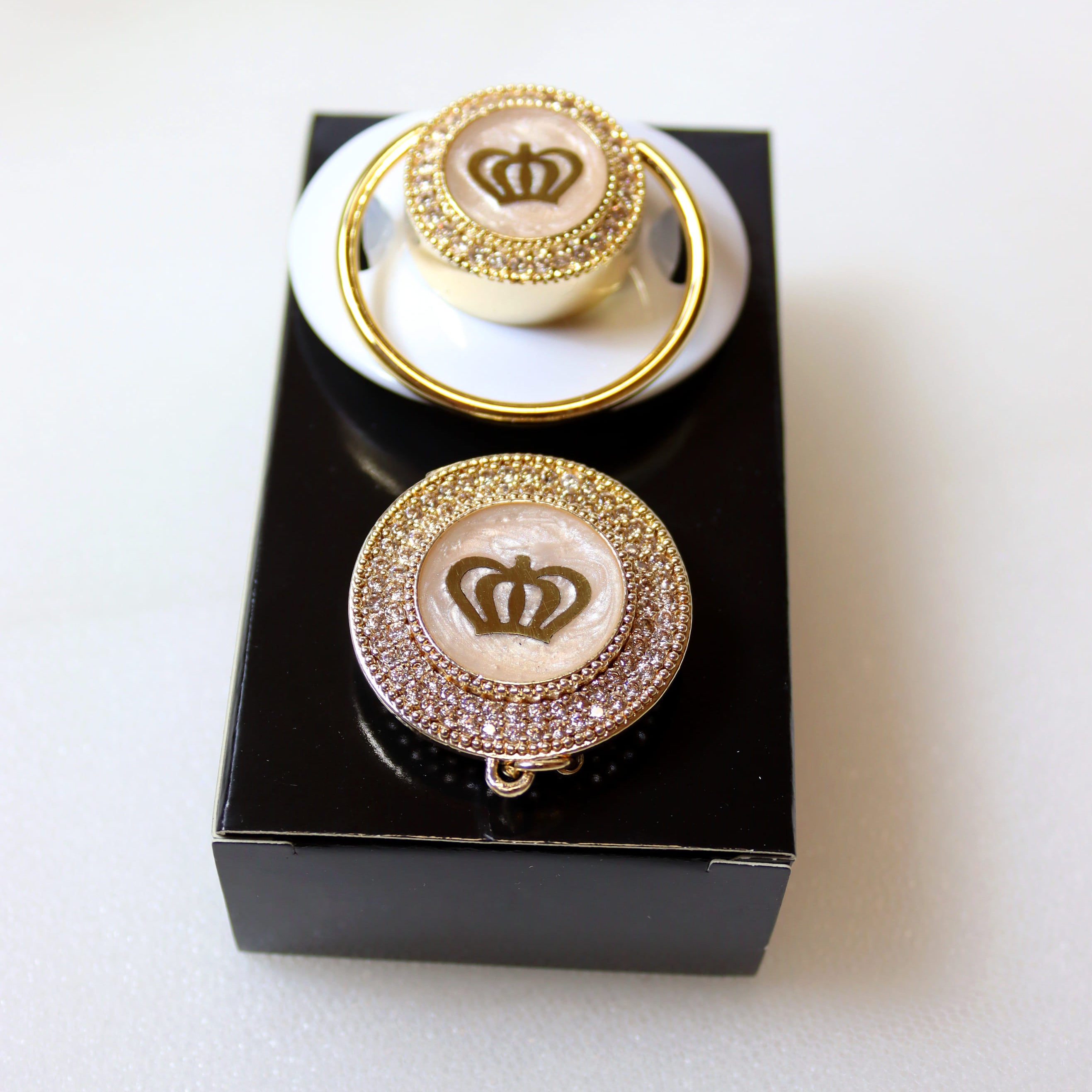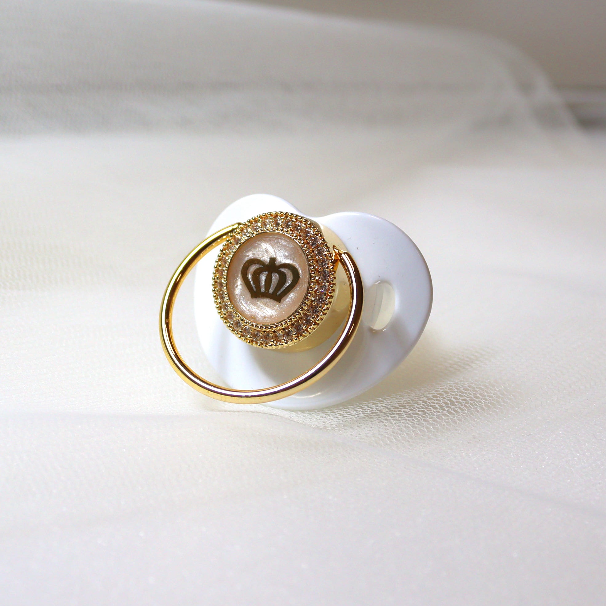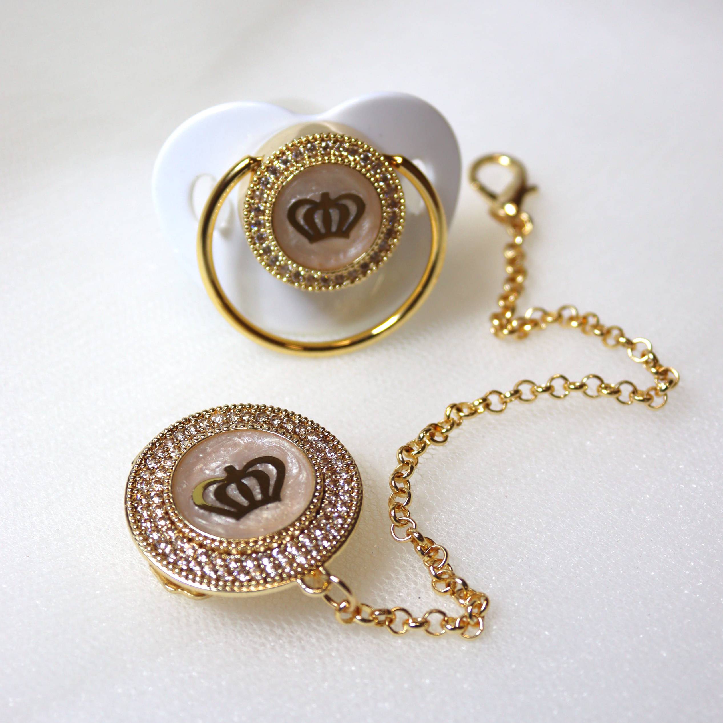 Handmade luxury pacifier with white base, crown design and matching clip chain. Unique pacifiers with rhinestones for your baby's most special appearances!