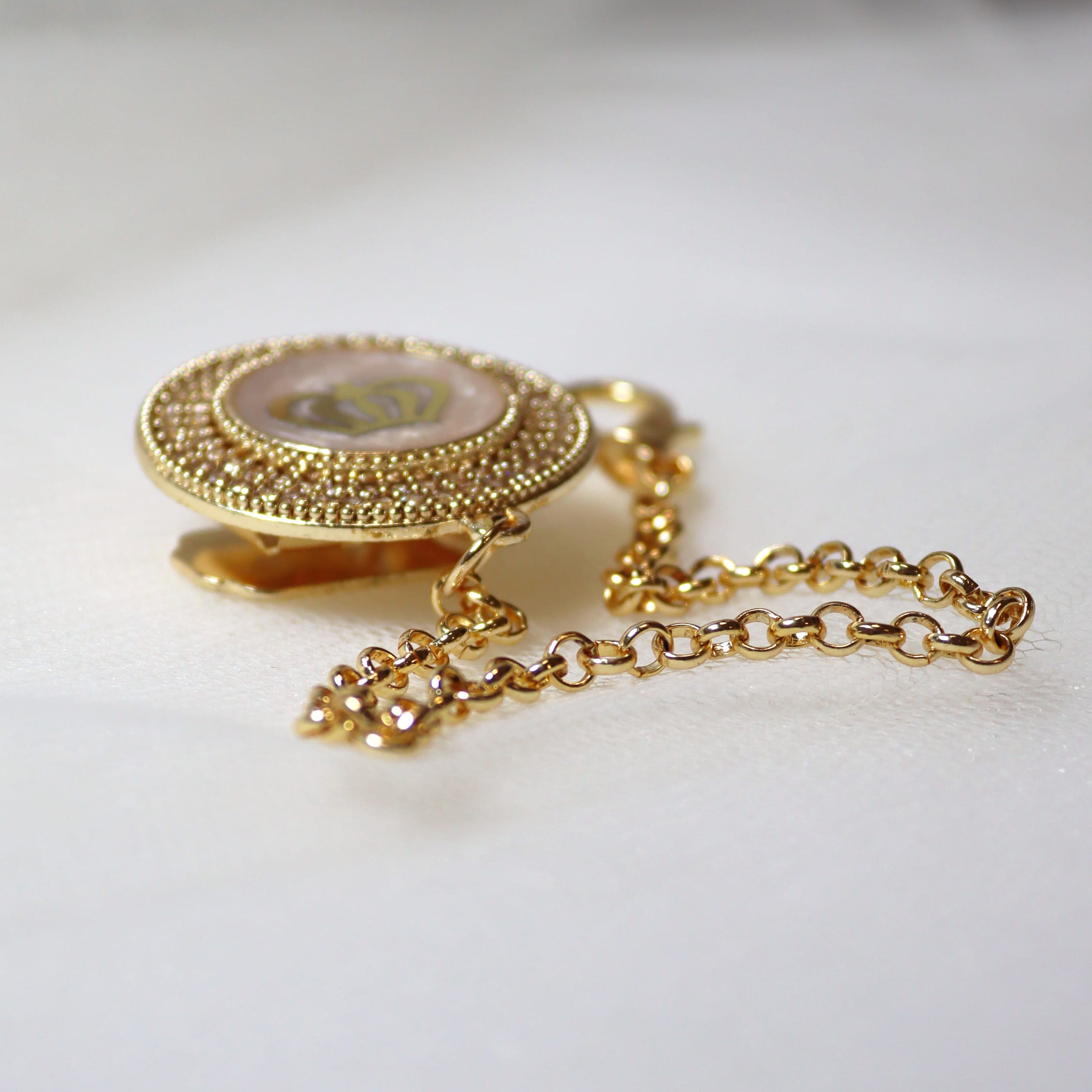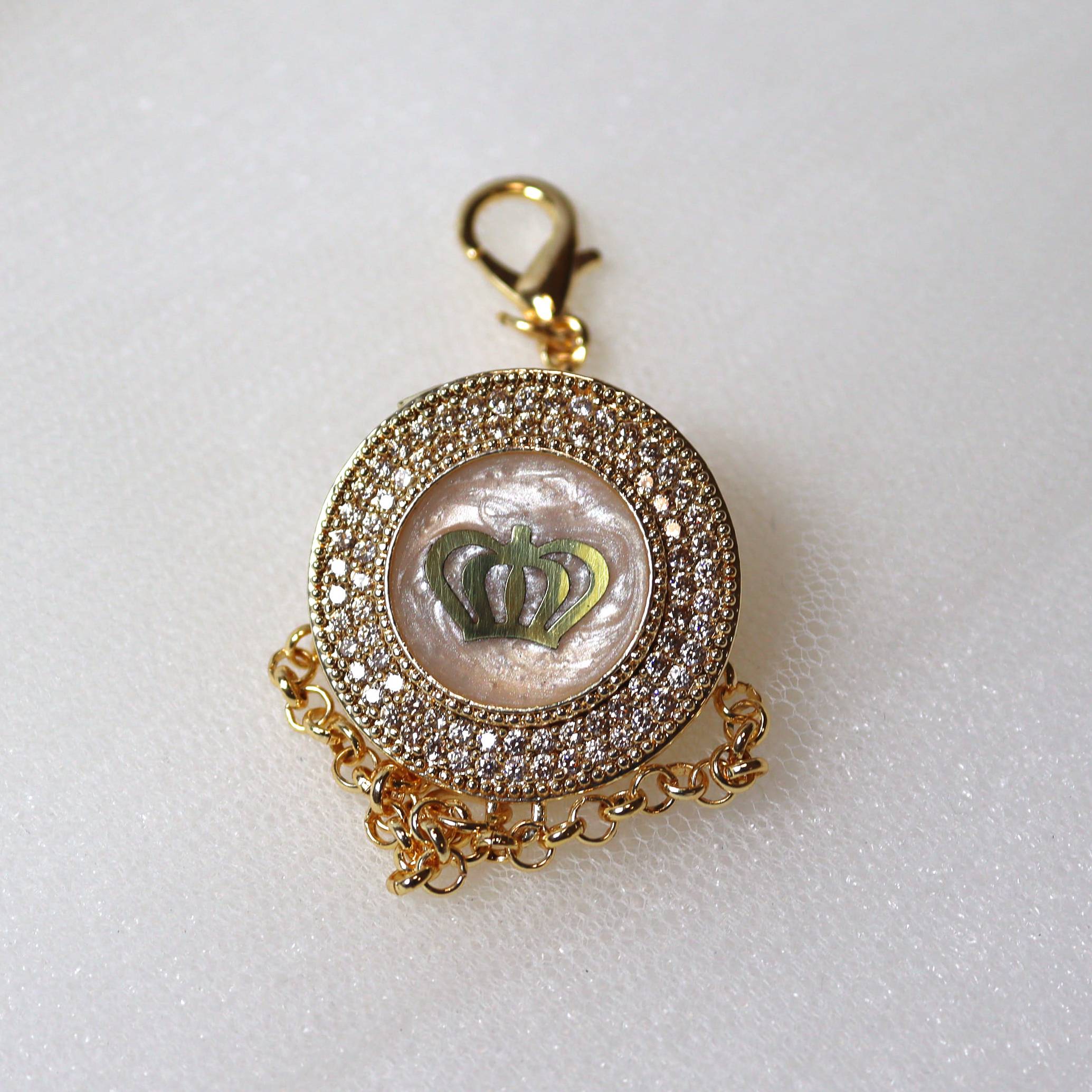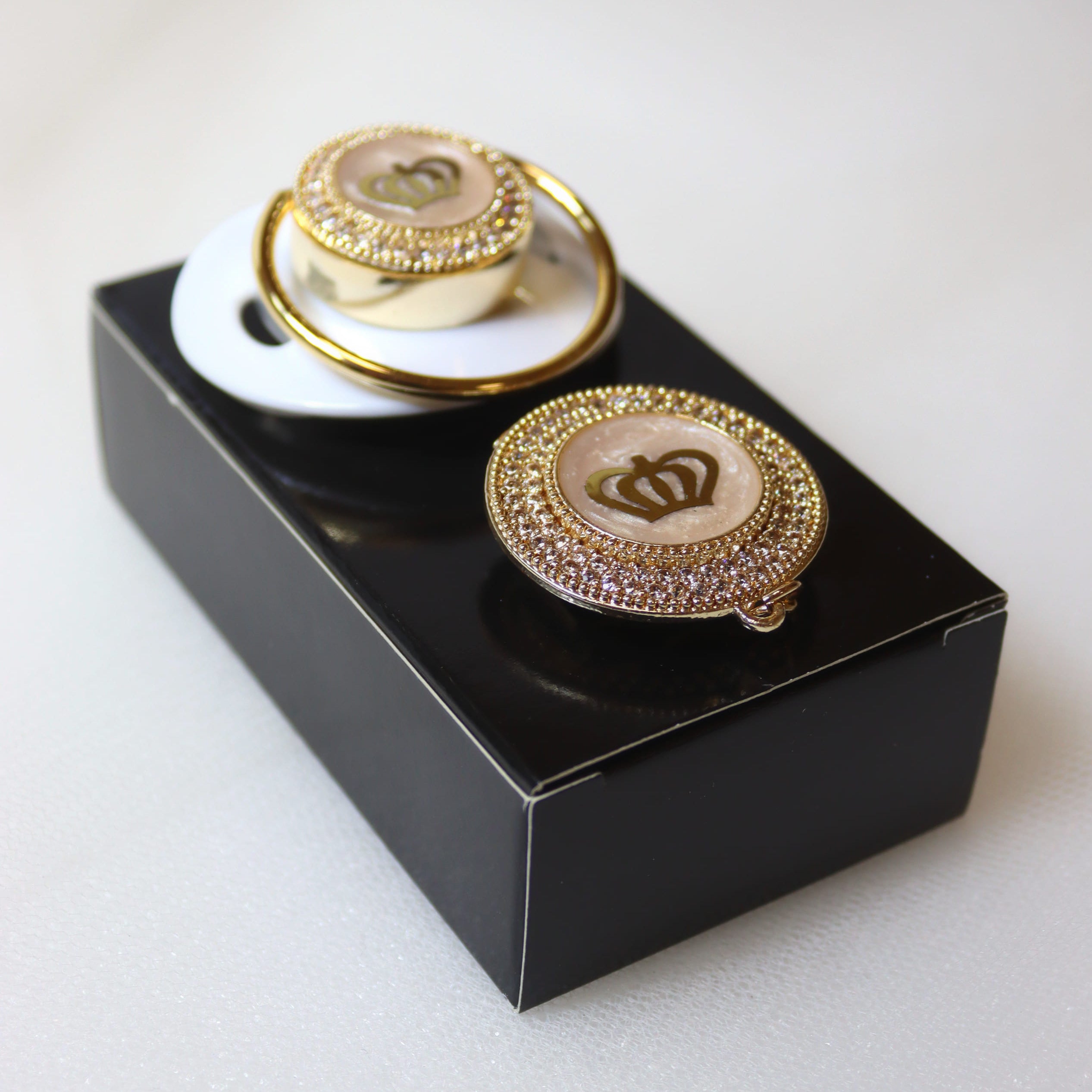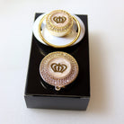 Handmade luxury pacifier with white base, crown design and matching clip chain. Unique pacifiers with rhinestones for your baby's most special appearances!