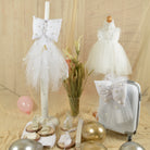 An all-white complete baptism package for your little one, with pom pom accents and stardust!