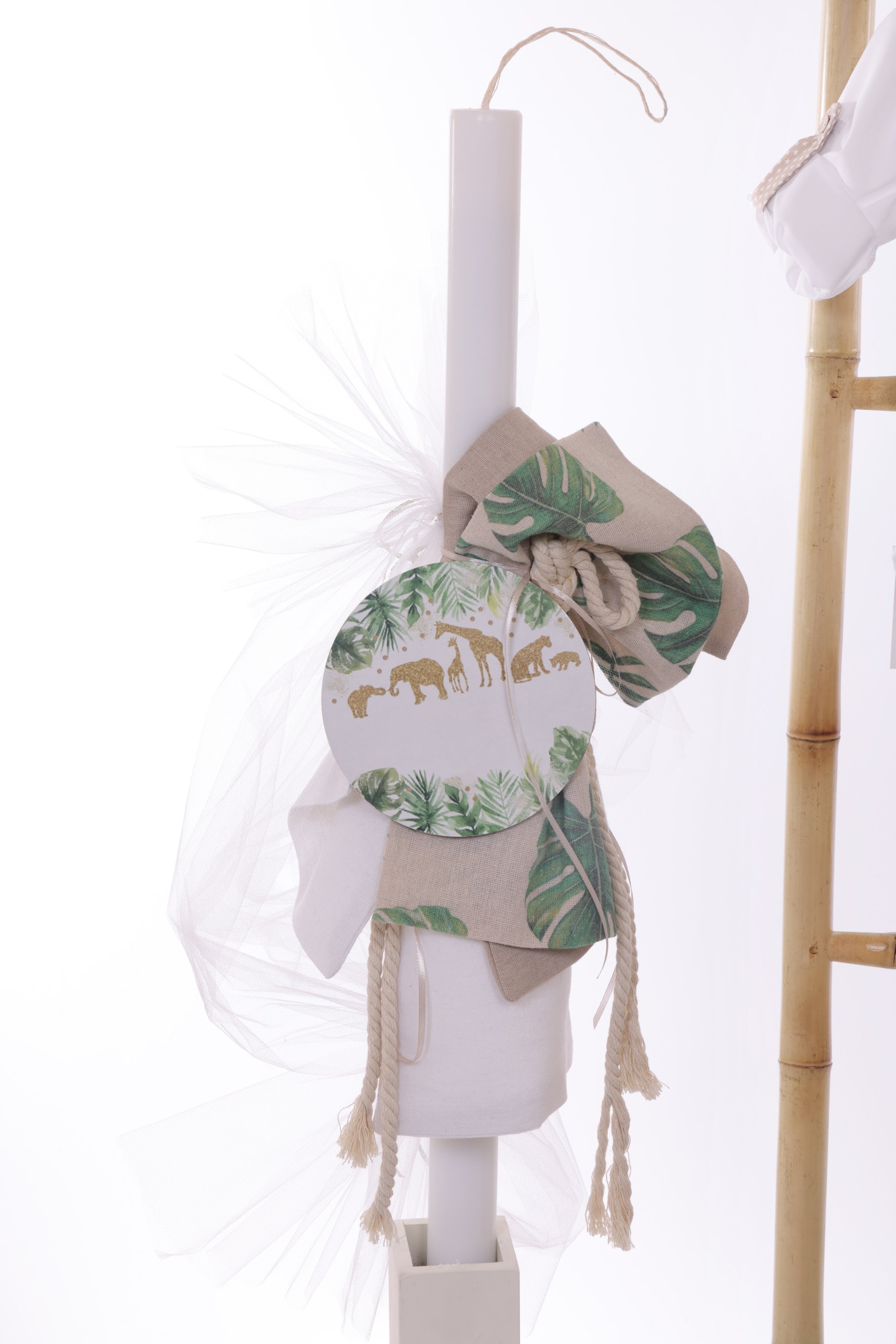 Θέμα εμπνευσμένο από τον κόσμο των ζώων! Ρούχα σε γήινες αποχρώσεις, λαμπάδα με χαριτωμένα ζωάκια και jungle αξεσουάρ.
