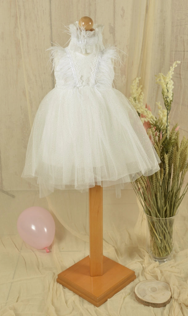 Ένα εντυπωσιακό ολόλευκο βαπτιστικό φόρεμα με εντυπωσιακά διακοσμητικά φτερα και λάμψη αστερόσκονης, που εκπέμπει μια αίσθηση αριστοκρατίας και λάμψης.