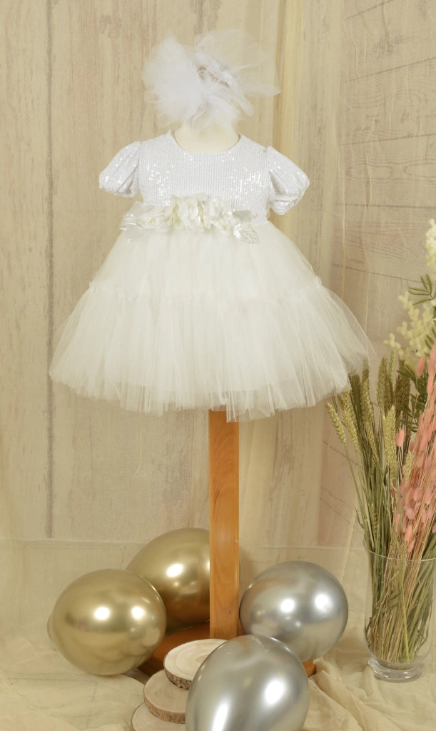 Ένα ξεχωριστό, αστραφτερό φόρεμα σε ασημί και λευκές αποχρώσεις, με πλούσια τούλινα layers, διακοσμητικά λουλούδια και αστραφτερές λεπτομέρειες, που θα μαγέψει τα πλήθη.