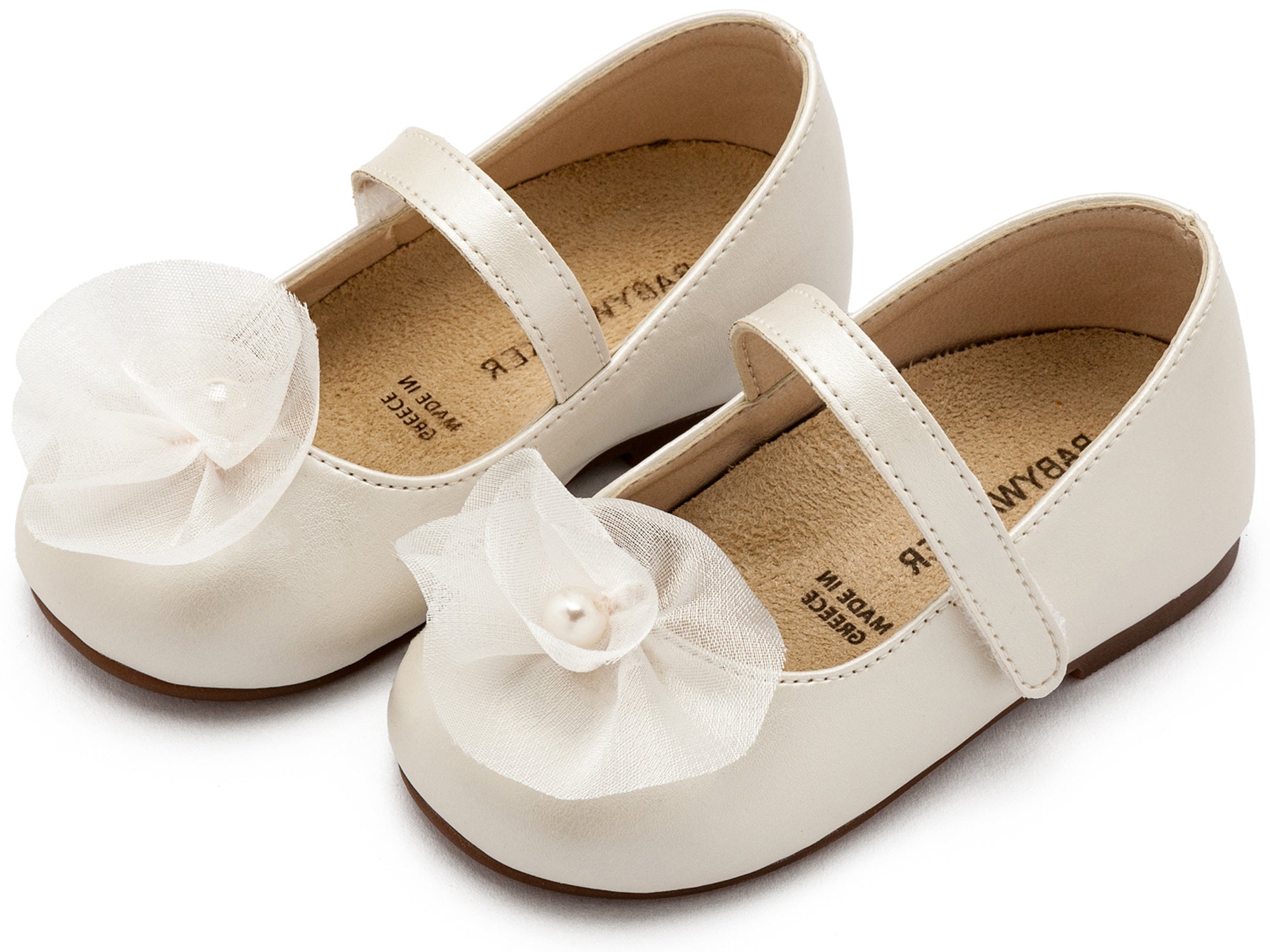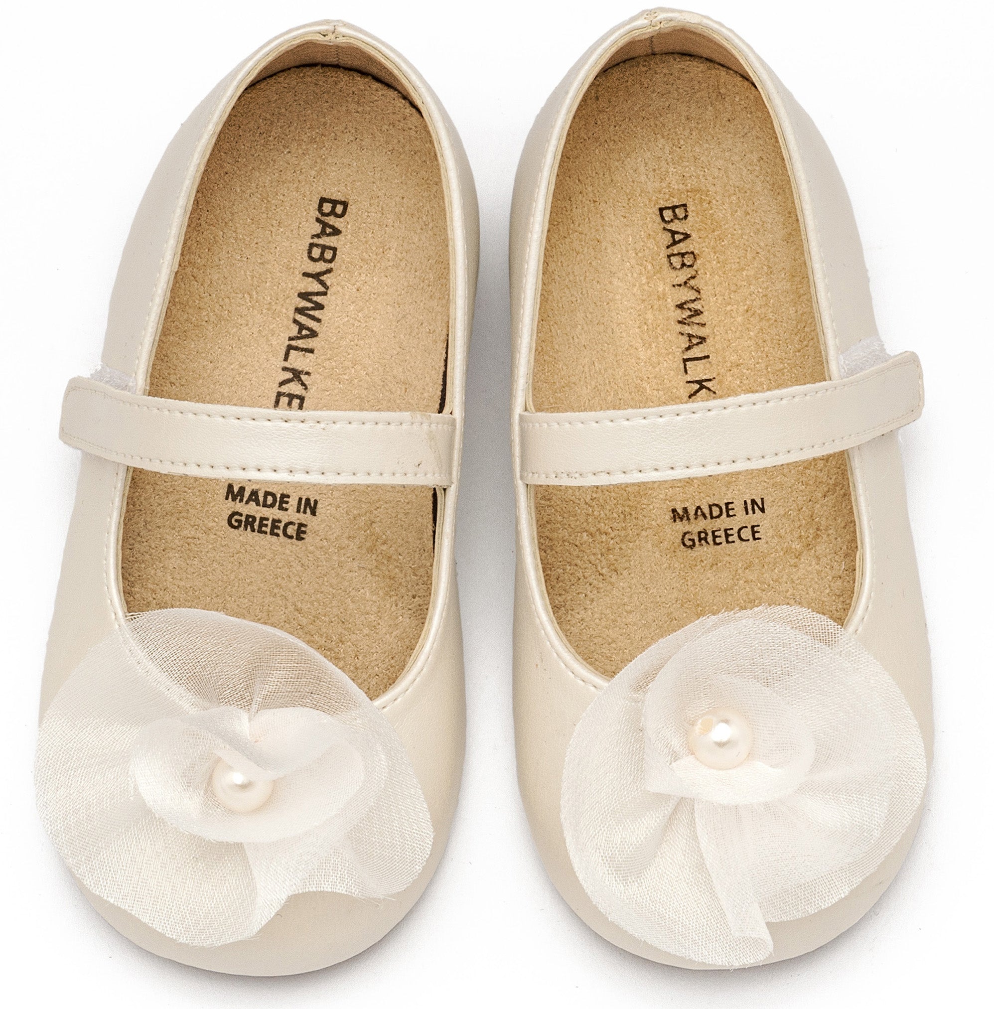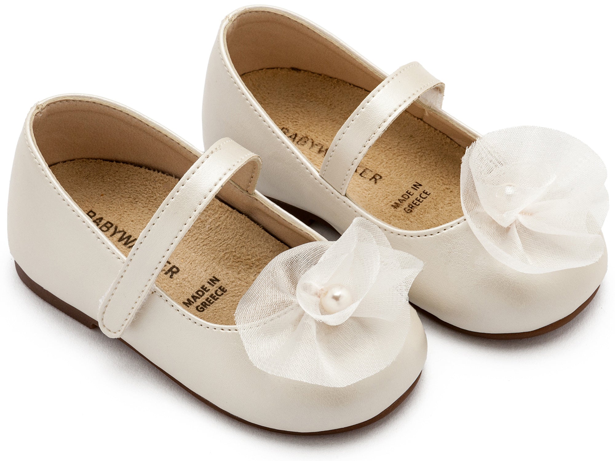 Γοβάκι Μονή Μπαρέτα με Χειροποίητο Λουλούδι απο Οργάντζα και Πέρλα σε Εκρού Χρώμα