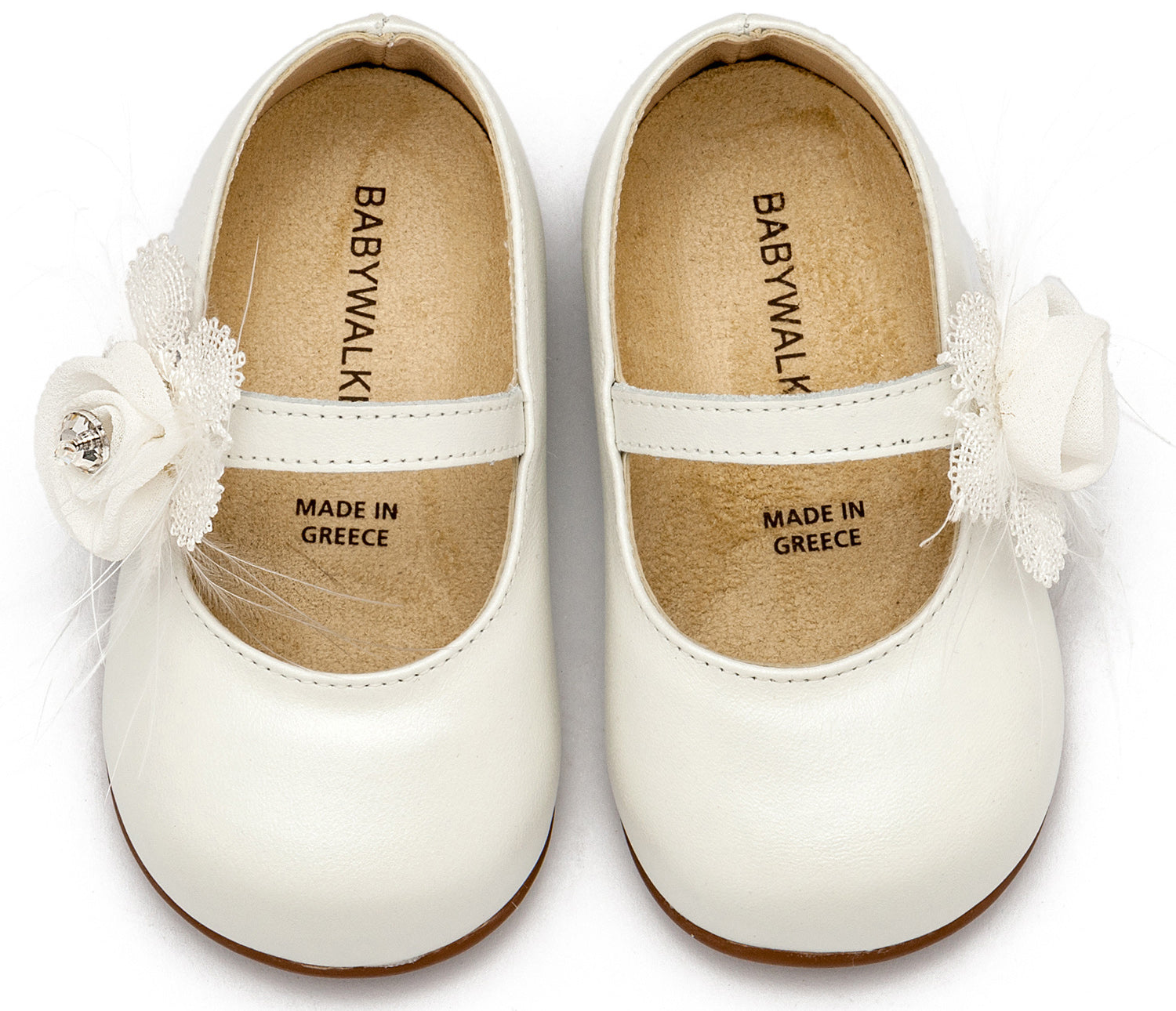 Δερμάτινο Γοβακι Μονή Μπαρέτα με Χειροποίητο Λουλουδάκι με Πούπουλα από Δέρμα Πέρλα σε Εκρού Χρώμα