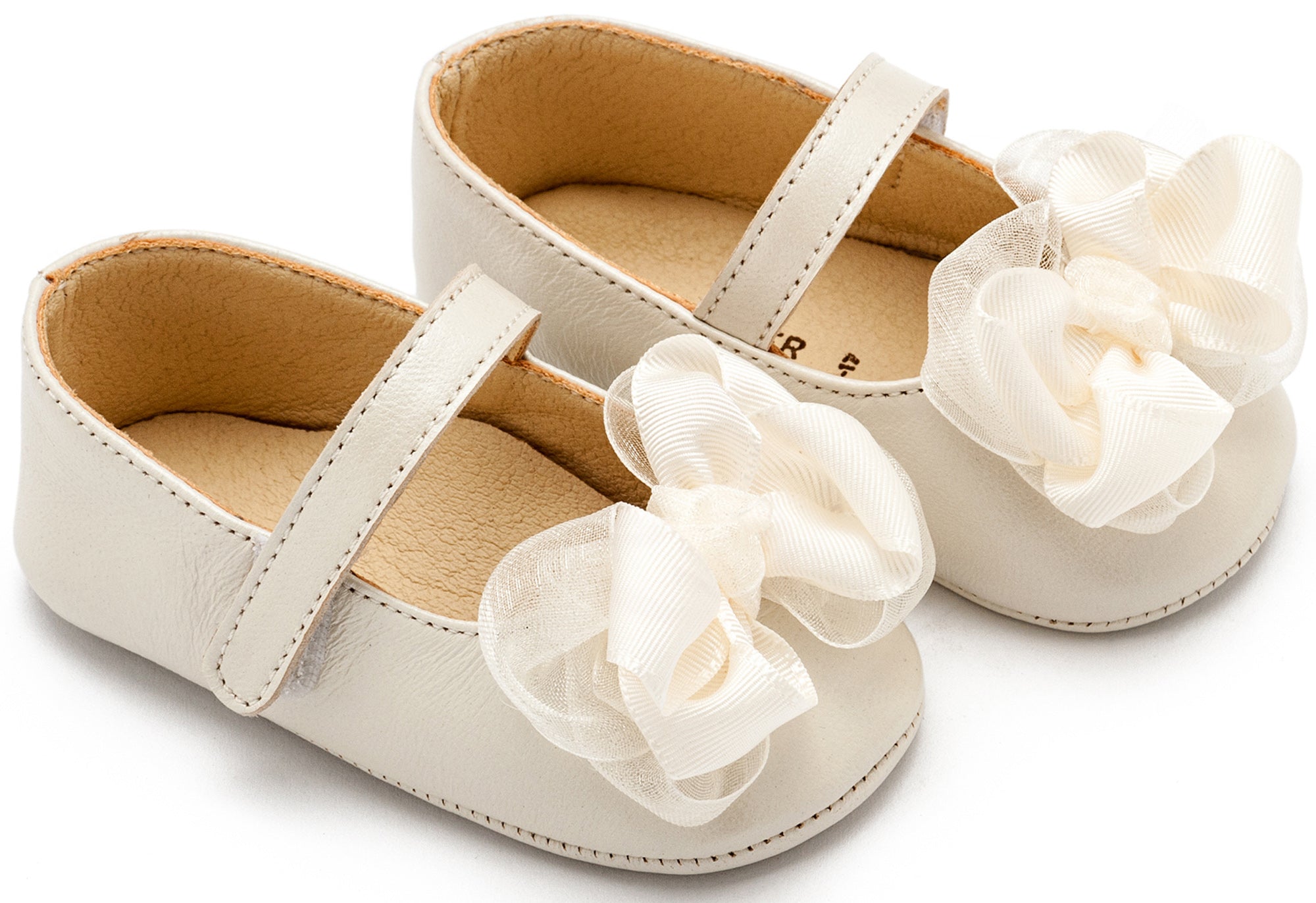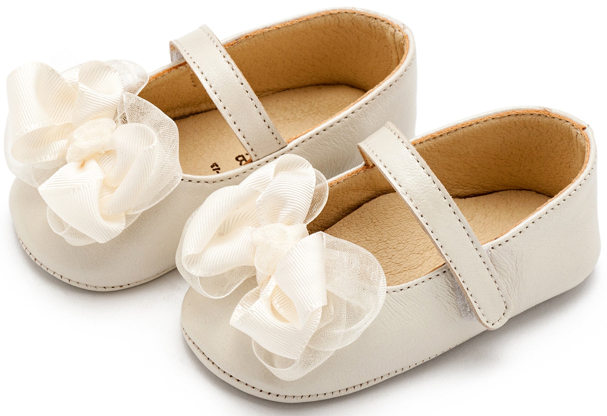 Δερμάτινο Γοβάκι Μονή Μπαρέτα με Υφασμάτινο Χειροποίητο Φιογκάκι σε Εκρού Χρώμα