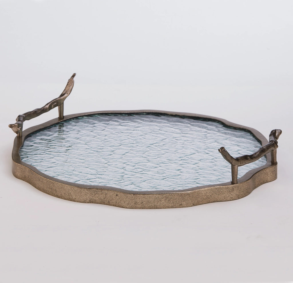 Αναδείξτε την γαμήλια τελετή σας με αυτόν τον εξαιρετικό χειροποίητο δίσκο γάμου από μπρούντζο, με κομψά σμιλεμένη βάση από ματ γυαλί. Το οργανικό του σχήμα και τα καλλιτεχνικά χερούλια που θυμίζουν κλαδιά αποπνέουν την κομψότητα και τη διαχρονική ομορφιά της φύσης. Ιδανικός για τη διακόσμηση του γαμήλιου τραπεζιού, αυτός ο μοναδικός δίσκος προσθέτει μια πινελιά πολυτέλειας στην πιο σημαντική ημέρα της ζωής σας.