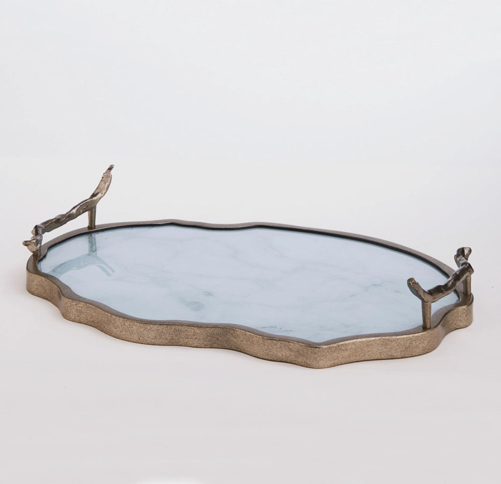 Αναδείξτε την γαμήλια τελετή σας με αυτόν τον εξαιρετικό χειροποίητο δίσκο γάμου από μπρούντζο, με κομψά σμιλεμένη βάση από ματ γυαλί. Το οργανικό του σχήμα και τα καλλιτεχνικά χερούλια που θυμίζουν κλαδιά αποπνέουν την κομψότητα και τη διαχρονική ομορφιά της φύσης. Ιδανικός για τη διακόσμηση του γαμήλιου τραπεζιού, αυτός ο μοναδικός δίσκος προσθέτει μια πινελιά πολυτέλειας στην πιο σημαντική ημέρα της ζωής σας.