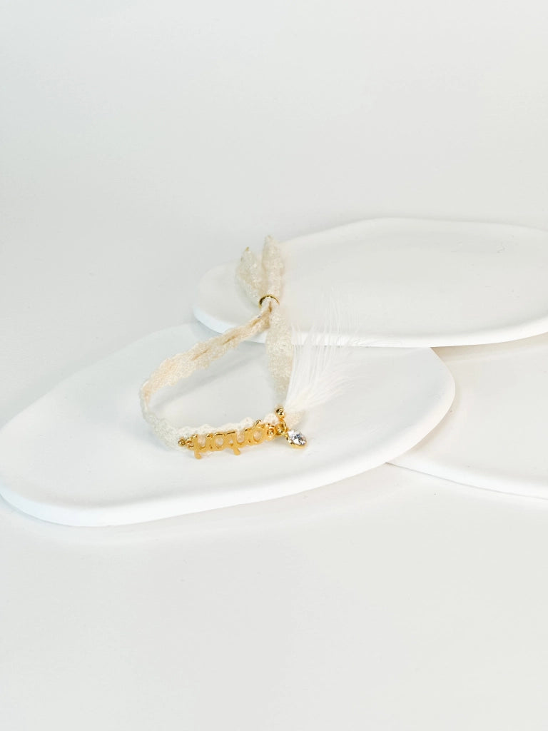 Βραχιολάκι με δαντέλα για την μαμά,την νονά και την γιαγιά μαζί με φτερό και σβαρόφσκι.Οι φωτογραφίες έχουν υποστεί επεξεργασία,ίσως να διαφέρουν λίγο τα χρώματα στην πραγματικότητα.