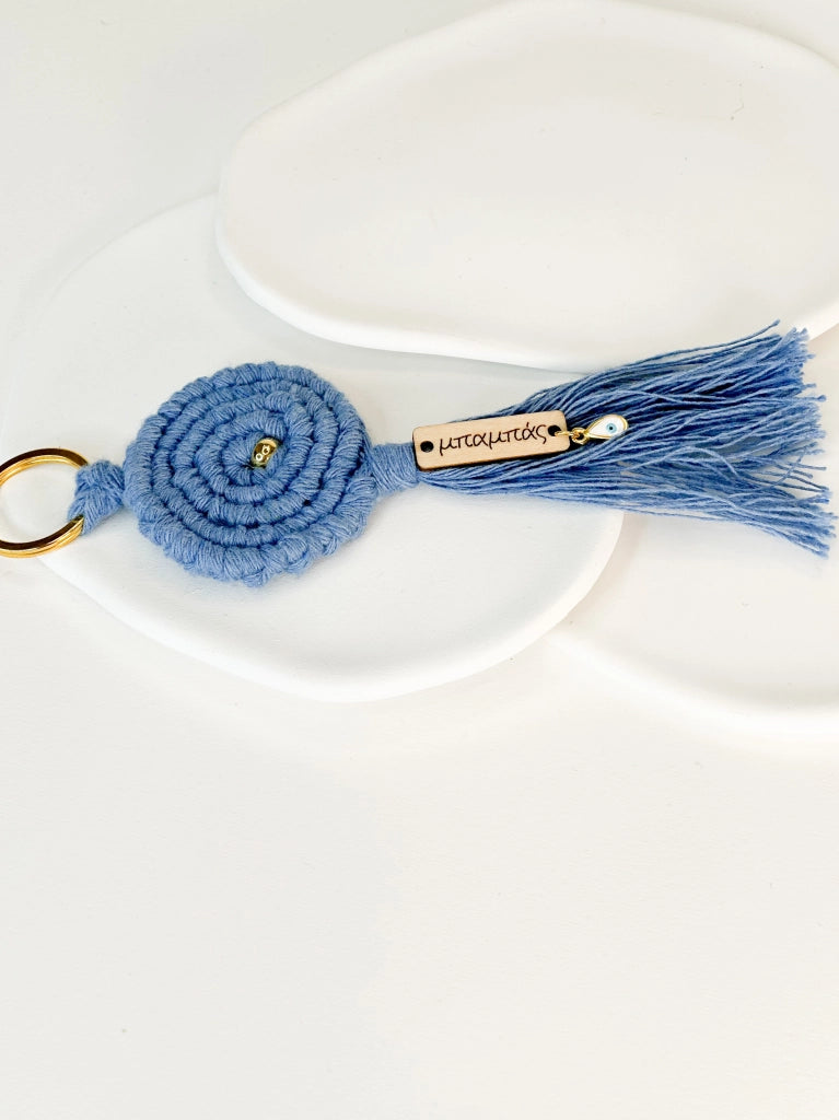 Μακραμέ μπρελόκ σε μπλε απόχρωση για τον μπαμπά,τον νονό,τον παππού,τον αδερφό και τον κουμπάρο.Τα μακραμέ μπρελόκ χρειάζονται περίπου 5 εργάσιμες να ετοιμαστούν.