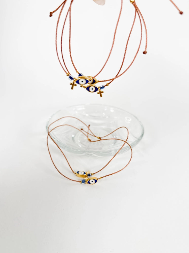 Χειροποίητο μαρτυρικό βραχιόλι με μίνιμαλ σχέδιο, διακοσμητικό ματάκι και χρυσές λεπτομέριες.