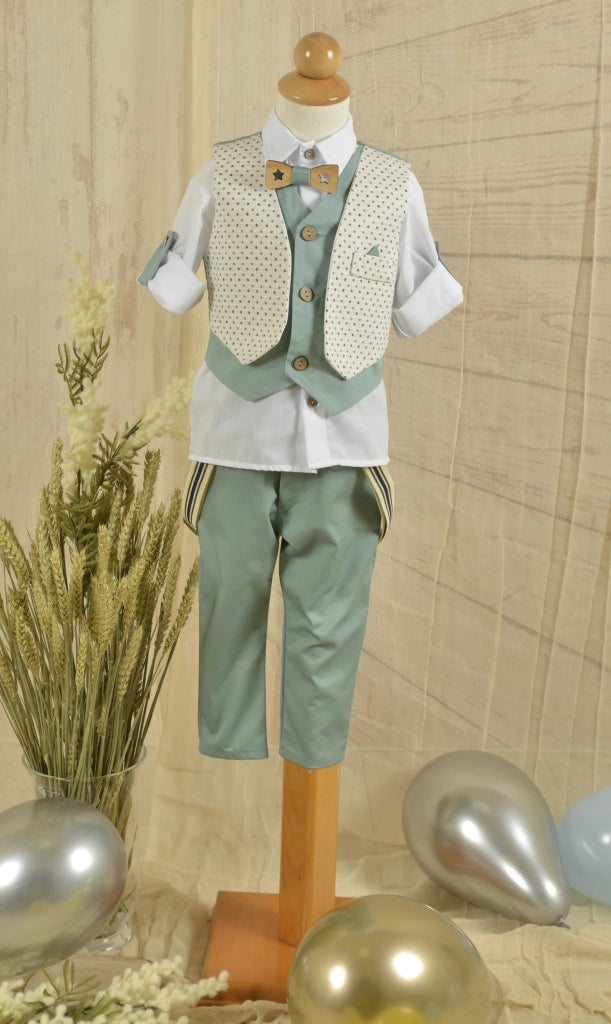 Ένα υπέροχο βαπτιστικό σύνολο για αγόρι, με ζωηρά χρώματα και μοναδικό στυλ που συνδυάζει το κλασικό με το μοντέρνο σε τόνους πράσινο μέντας και μπεζ. Το τέλειο βαπτιστικό ρούχο για μικρούς gentlemen που θα συναρπάσει!