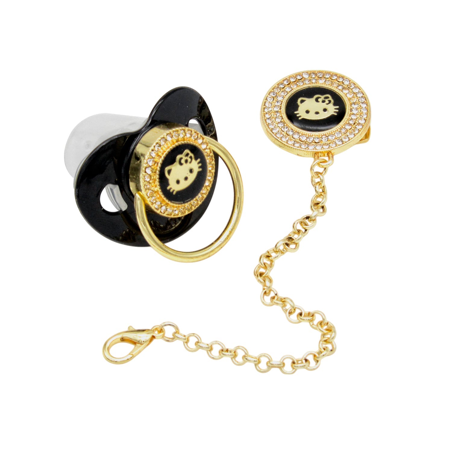 Χειροποίητη πιπίλα πολυτελείας με μαύρη βάση, σχέδιο γατούλα και ασορτί αλυσίδα κλιπ. Μοναδικές πιπίλες με στρας για τις πιο ξεχωριστές εμφανίσεις του μωρού σας!