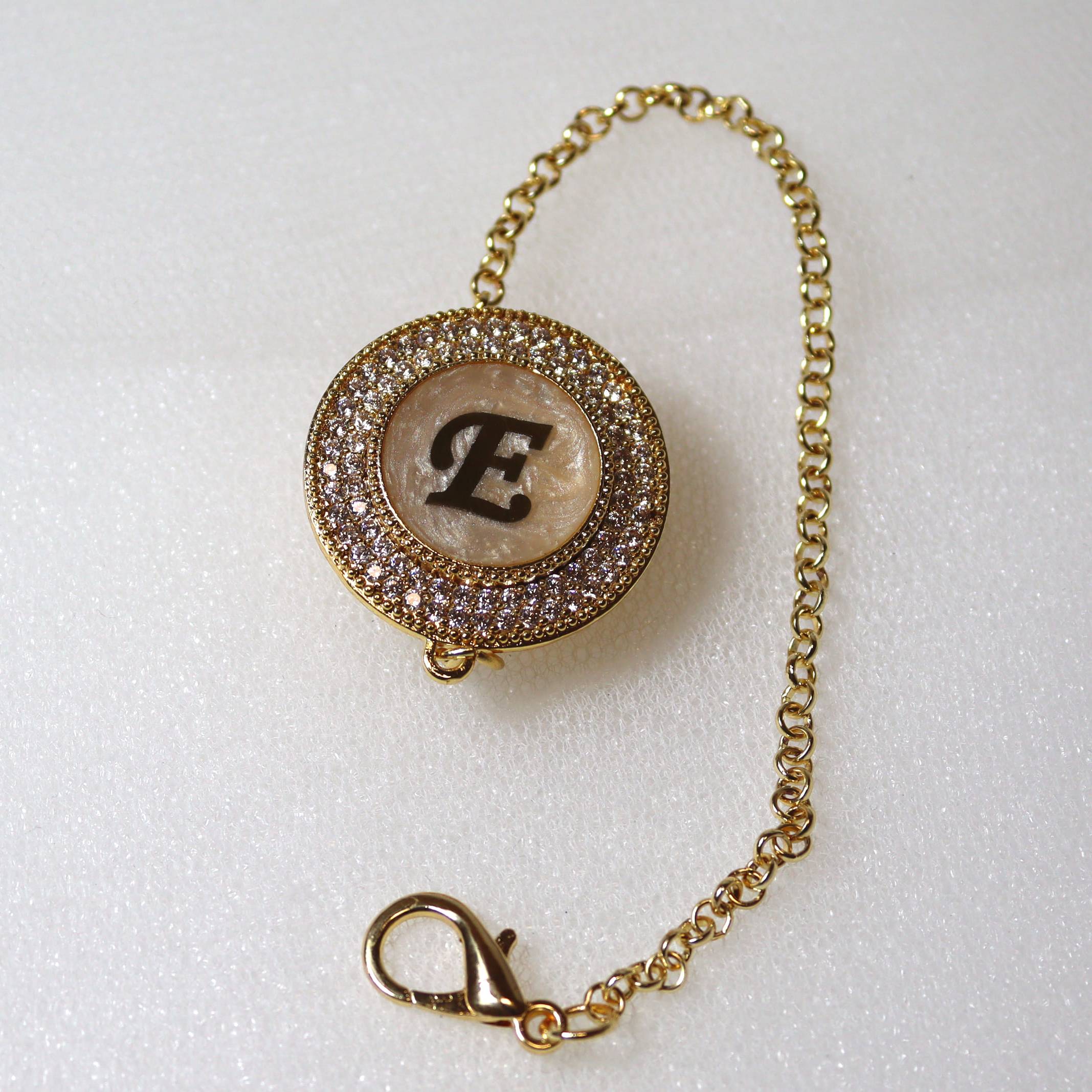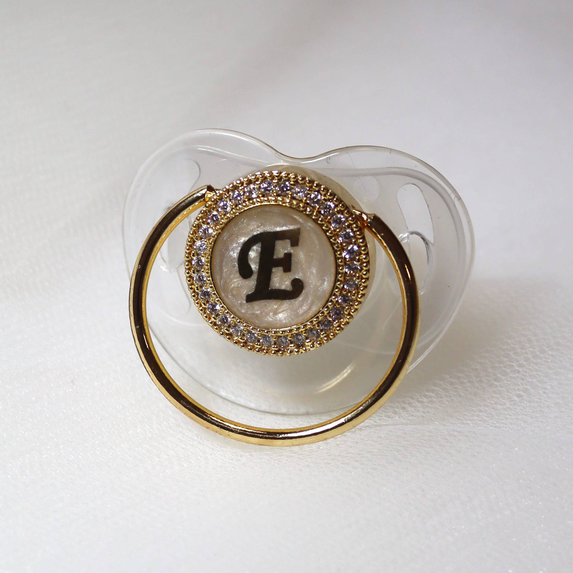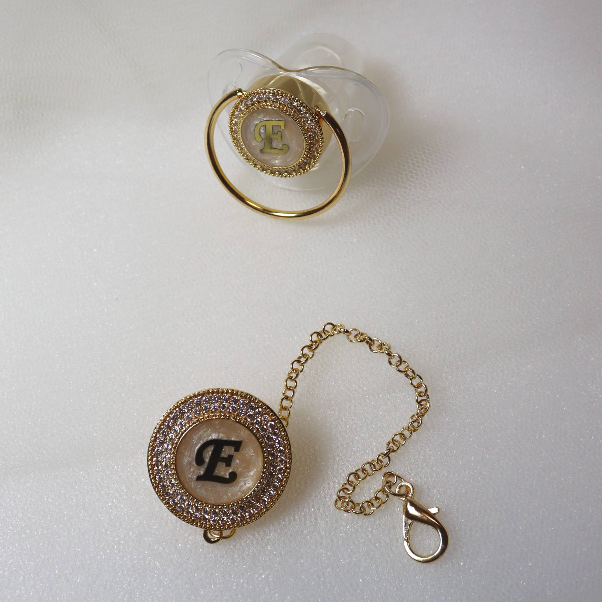 Χειροποίητη πιπίλα πολυτελείας με διάφανη βάση, σχέδιο μονόγραμμα* και ασορτί αλυσίδα κλιπ. Μοναδικές πιπίλες με στρας για τις πιο ξεχωριστές εμφανίσεις του μωρού σας!