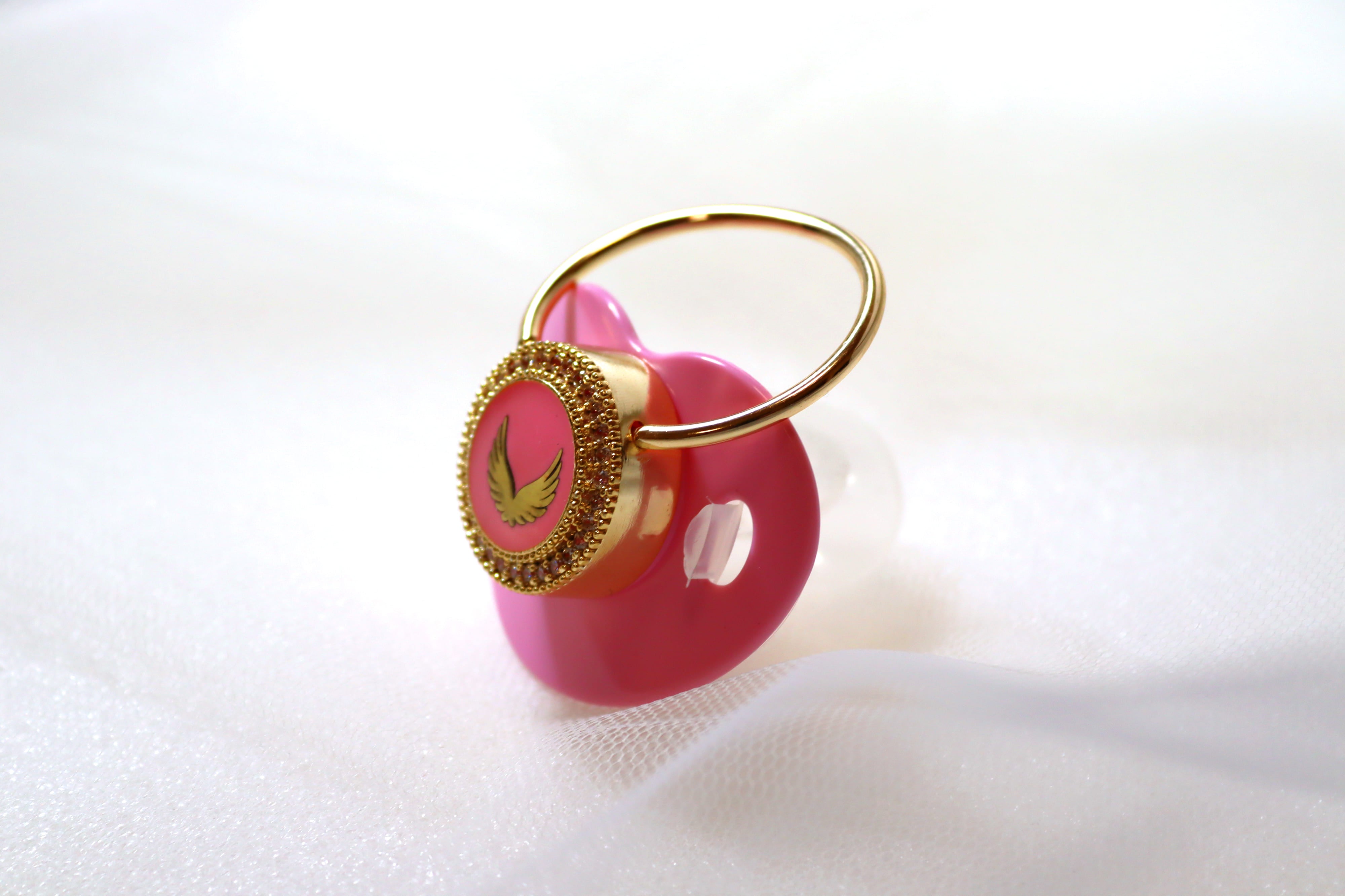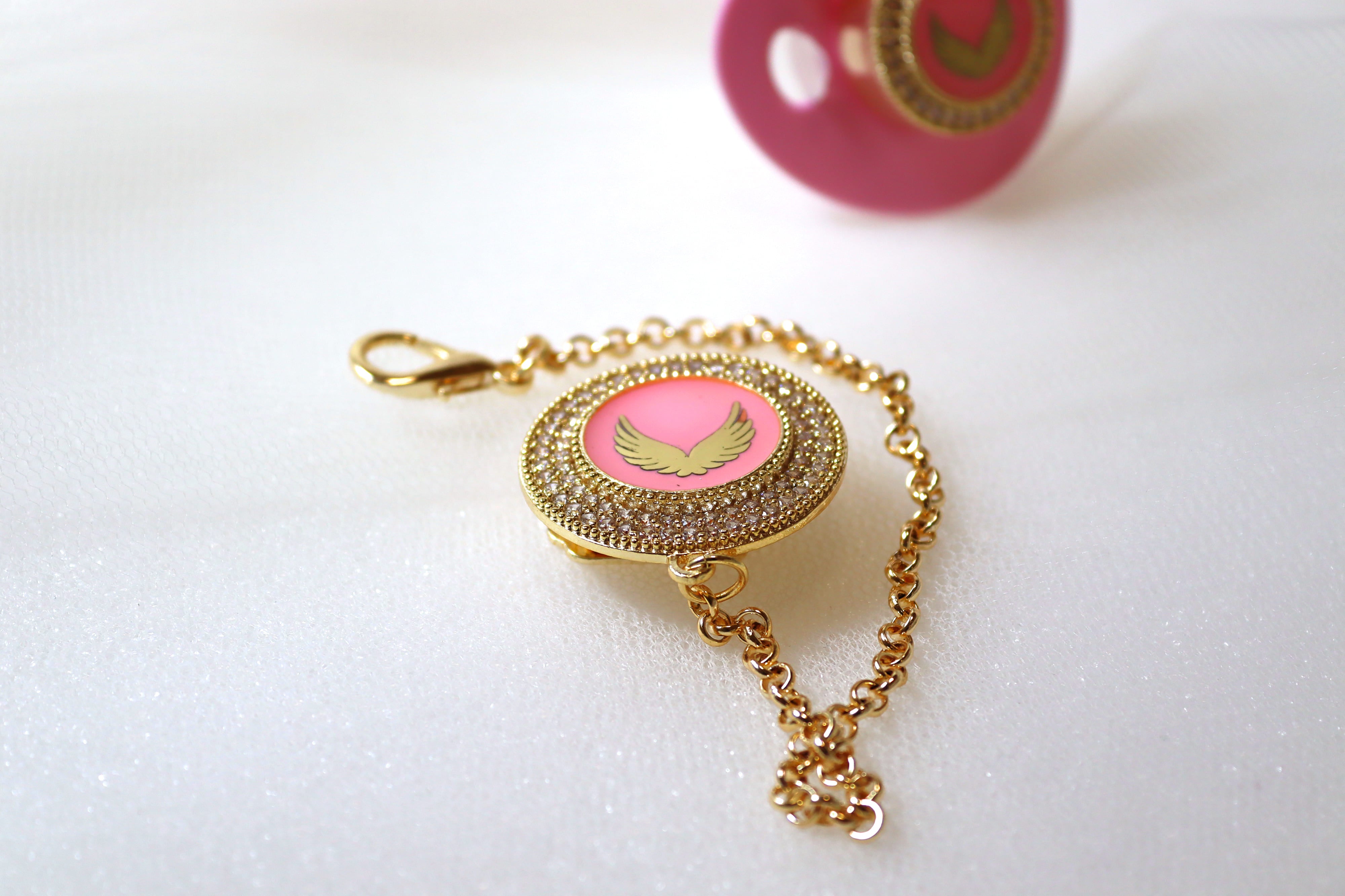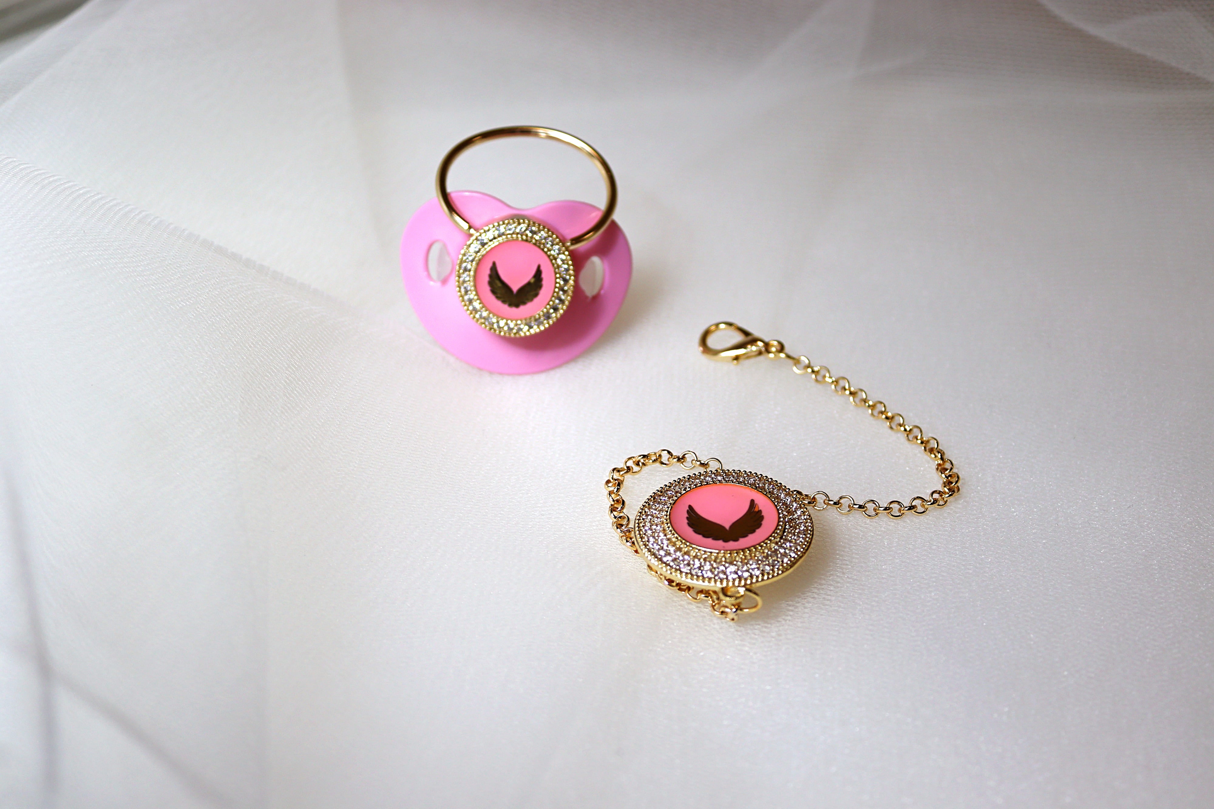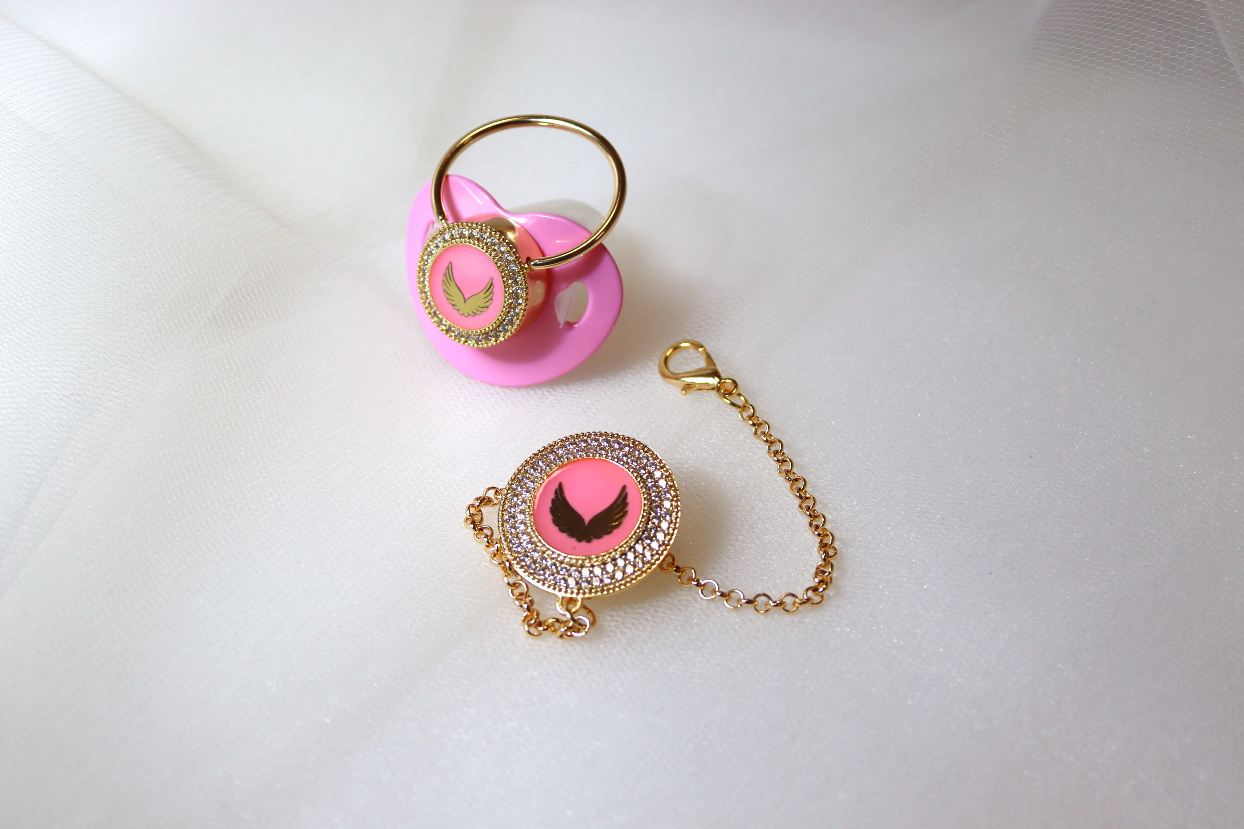 Χειροποίητη πιπίλα πολυτελείας με ροζ βάση και σχέδιο φτερά με ασορτί αλυσίδα κλιπ. Μοναδικές πιπίλες με στρας για τις πιο ξεχωριστές εμφανίσεις του μωρού σας!