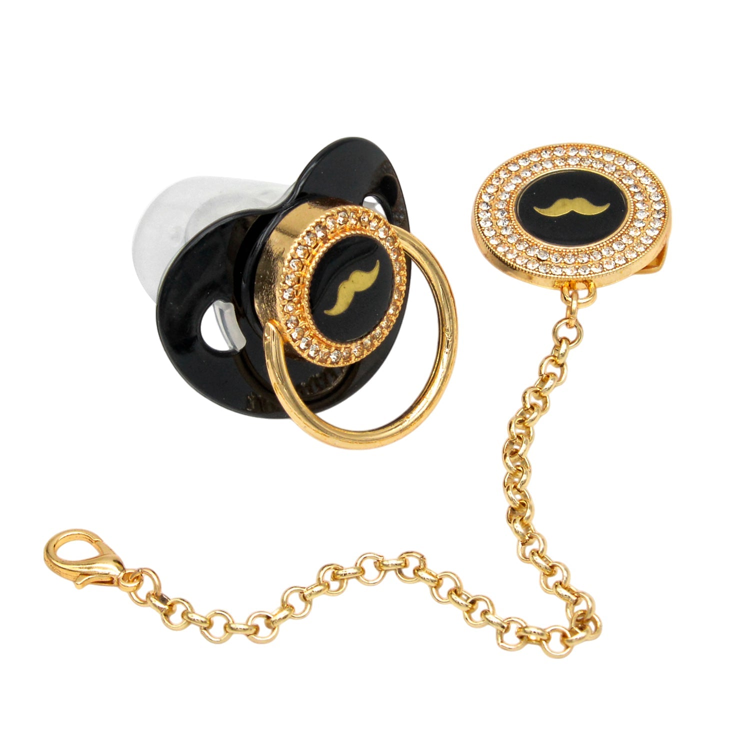 Χειροποίητη πιπίλα πολυτελείας με μαύρη βάση και σχέδιο μουστάκι με ασορτί αλυσίδα κλιπ. Μοναδικές πιπίλες με στρας για τις πιο ξεχωριστές εμφανίσεις του μωρού σας!