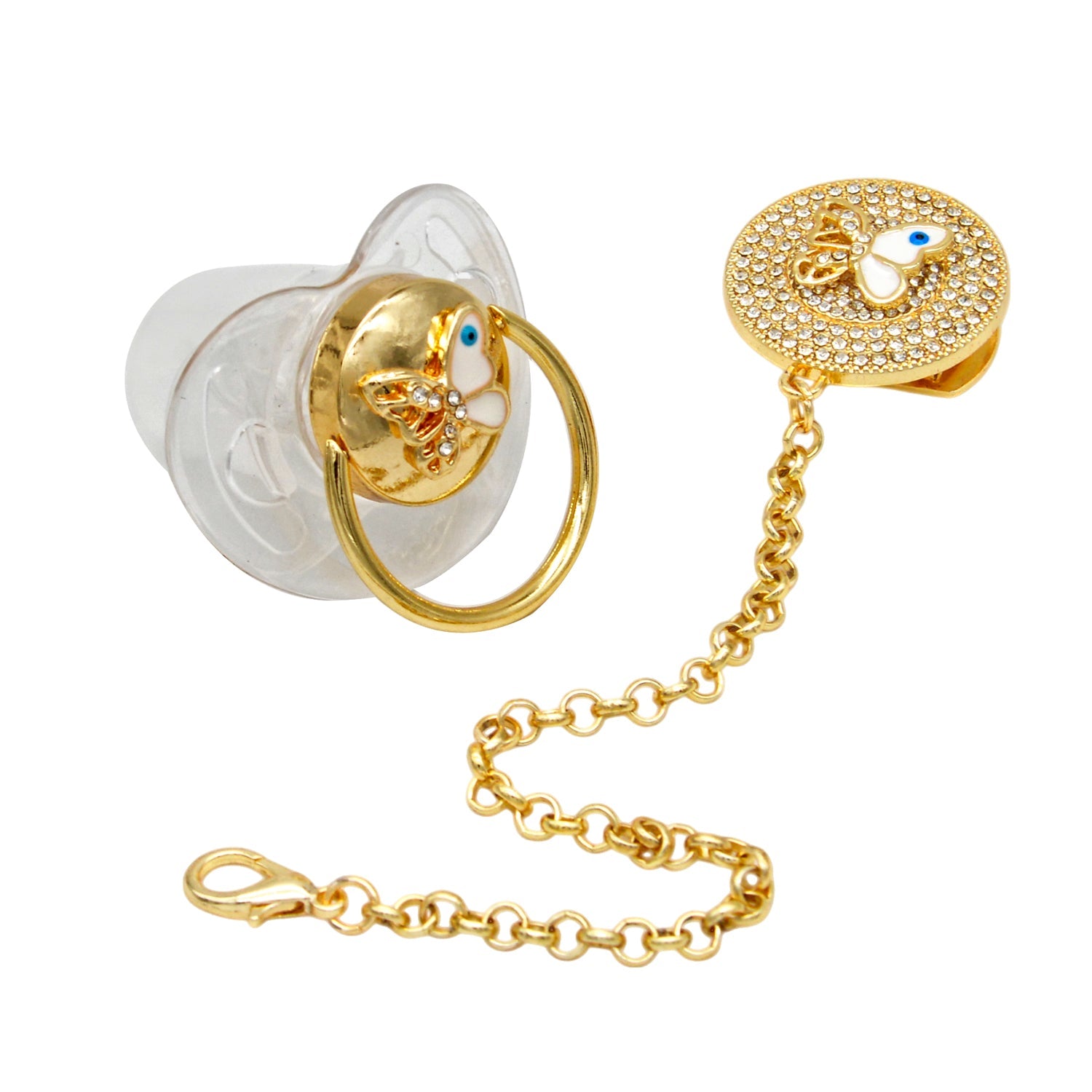Χειροποίητη πιπίλα πολυτελείας με διάφανη βάση, σχέδιο πεταλούδα και ασορτί αλυσίδα κλιπ. Μοναδικές πιπίλες με στρας για τις πιο ξεχωριστές εμφανίσεις του μωρού σας!