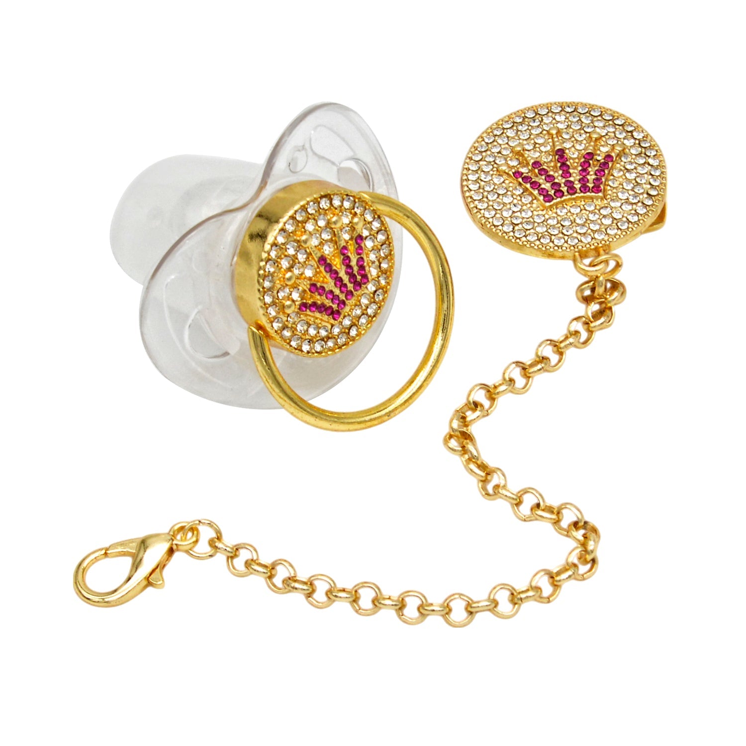 Χειροποίητη πιπίλα πολυτελείας με διάφανη βάση, σχέδιο στέμμα και ασορτί αλυσίδα κλιπ. Μοναδικές πιπίλες με στρας για τις πιο ξεχωριστές εμφανίσεις του μωρού σας!