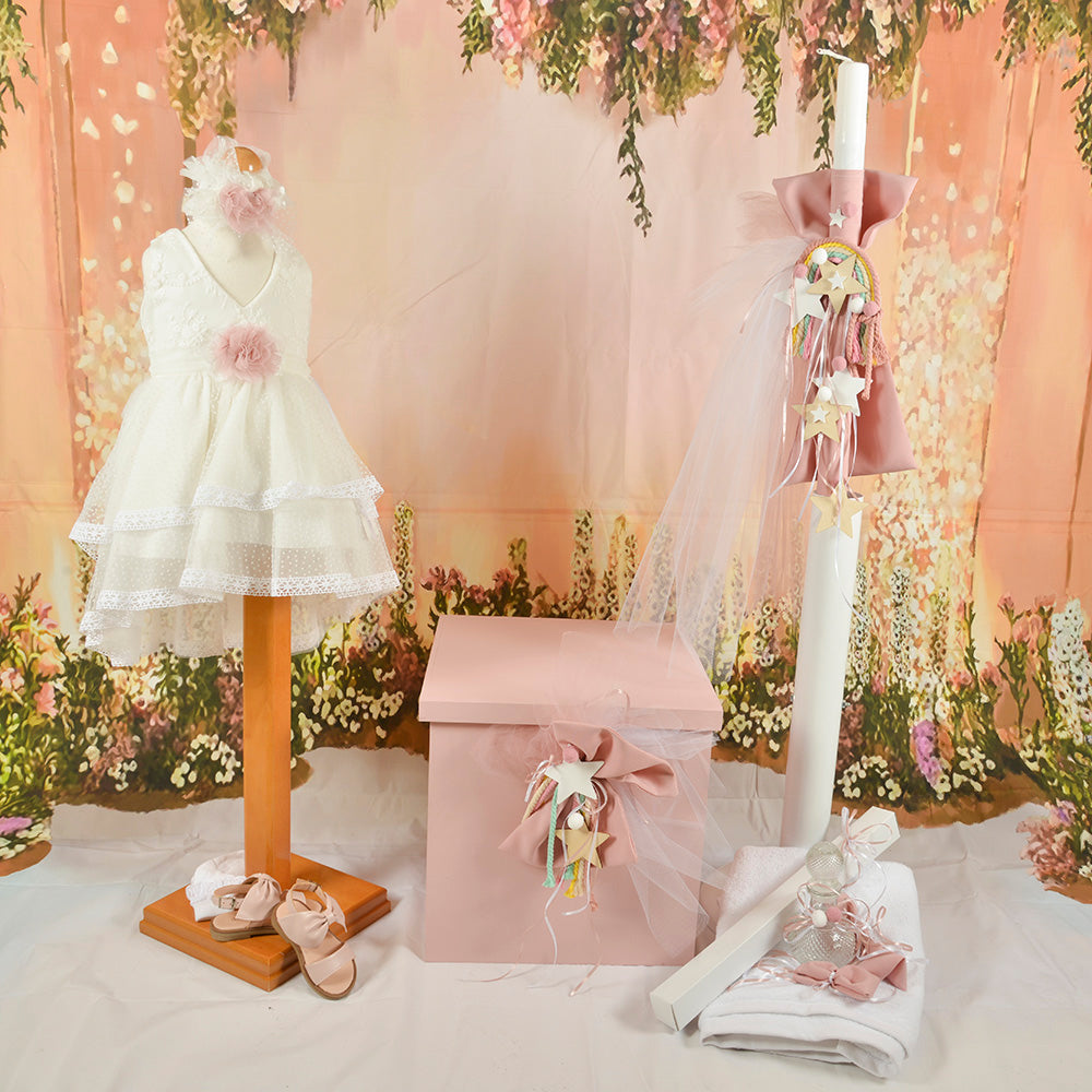 Ένα ολοκληρωμένο πακέτο βάπτισης που σας παρέχει όλα όσα χρειάζεστε για την ξεχωριστή ημέρα της μικρής σας, με ονειρεμένο σχεδιασμό και κομψότητα για να δημιουργήσει μοναδικές αναμνήσεις για τη μικρή σας.