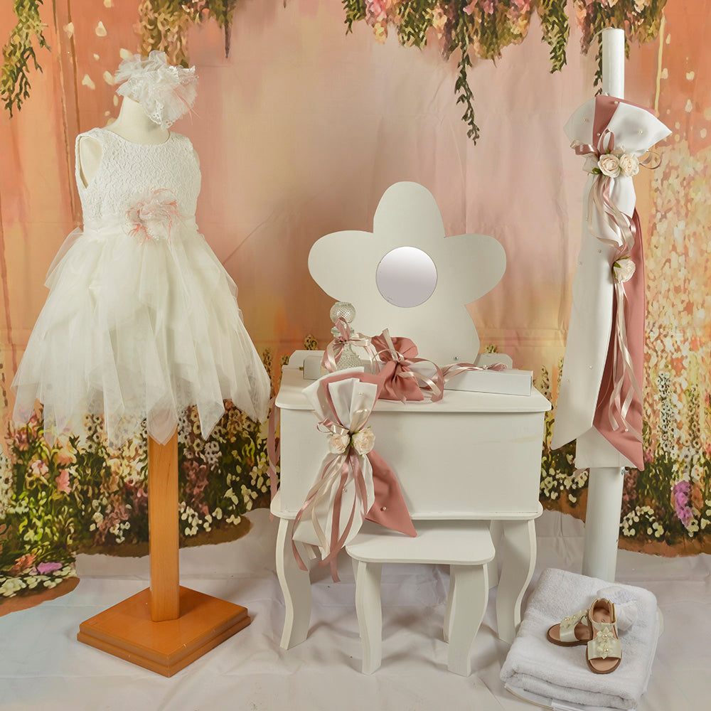Ένα ολοκληρωμένο πακέτο βάπτισης που σας παρέχει όλα όσα χρειάζεστε για την ξεχωριστή ημέρα της μικρής σας, με ονειρεμένο σχεδιασμό και κομψότητα για να δημιουργήσει μοναδικές αναμνήσεις για τη μικρή σας.
