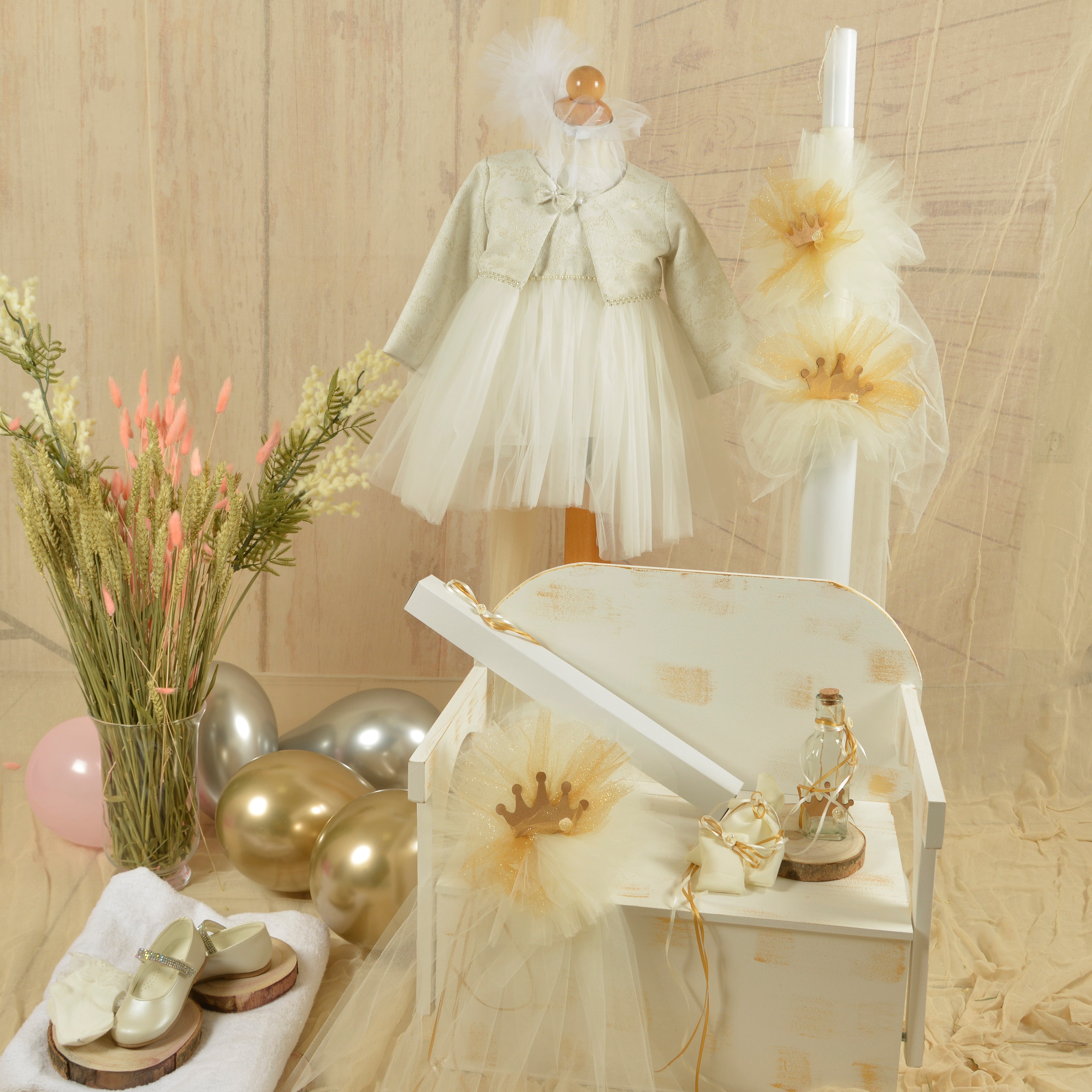 Ένα ολοκληρωμένο πακέτο βάπτισης για τη μικρή σας βασίλισσα, σε χρυσό- γκλίτερ αποχρώσεις.