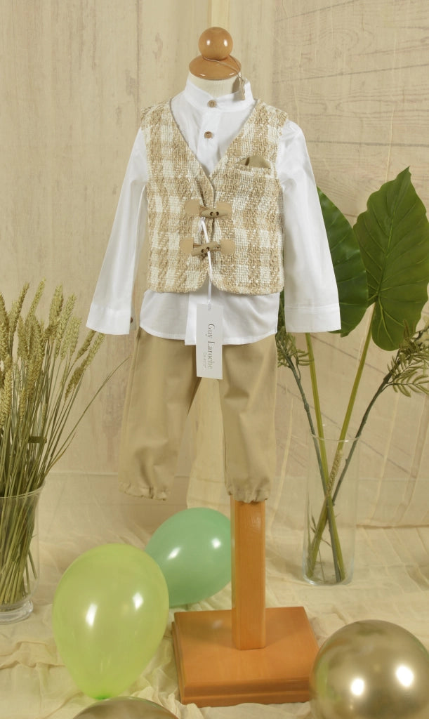 Ένα μοναδικό σχέδιο Guy Laroche για την πιο εντυπωσιακή εμφάνιση του μικρού σας! Γιλέκο και Παντελόνι σε μπεζ και off white τόνους, με ασορτί καπελάκι και λευκό πουκάμισο με κουμπάκια στο χρώμα του ξύλου. Το πιο στυλάτο βαπτιστικό ρούχο για αγόρι!