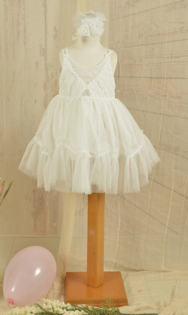 Ένα πανέμορφο off white βαπτιστικό φόρεμα από την Guy Laroche, με διακριτική κεντητή δαντέλα με λουλουδένια σχέδια, που αναδεικνύει την χάρη, την απλότητα και το ρομαντισμό.